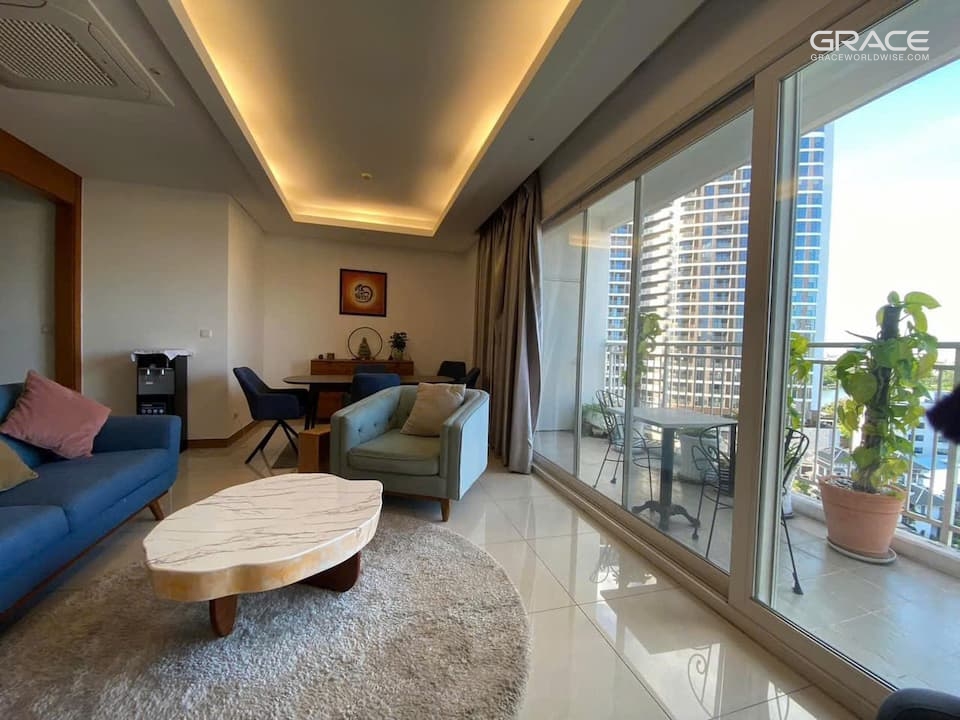 The luxury apartment XI Riverview Palace focuses on the design lines and surfaces of the building that harmonize with the surrounding natural environment. The front of XI Riverview Palace is designed to overlook the panoramic riverside view. The building's design lines not only blend with nature but also provide sound insulation from neighboring apartments.